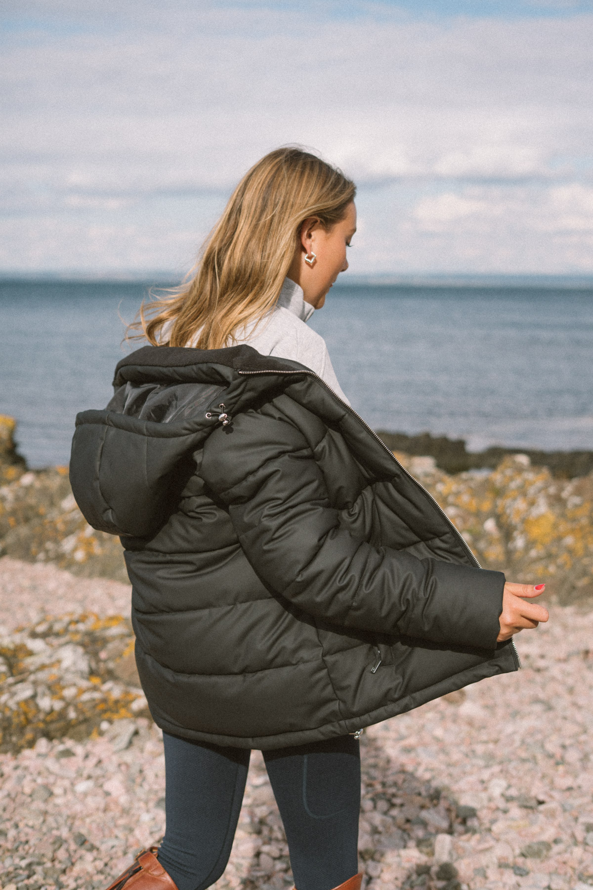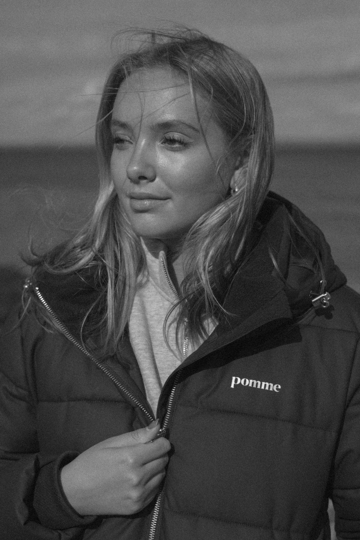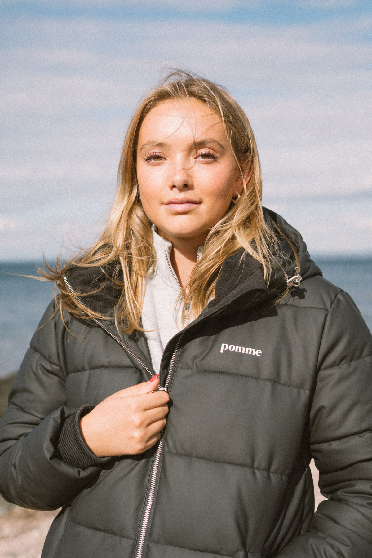 Practical details include reflective logo details, spacious pockets for essentials like your phone, and a roomy hood with a drawstring for added warmth. This makes the Pomme Poppy Jacket both a practical and stylish choice for colder months.
